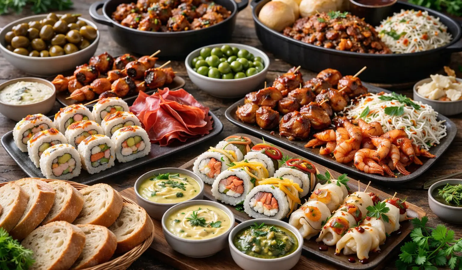 Het tapasmenu combineert verschillende smaken en gerechten, van vers gebakken brood met dips en sushi tot warme kipgerechten en pulled pork. De warme gerechten worden geleverd in happiepannen zodat ze eenvoudig opgewarmd en geserveerd kunnen worden.